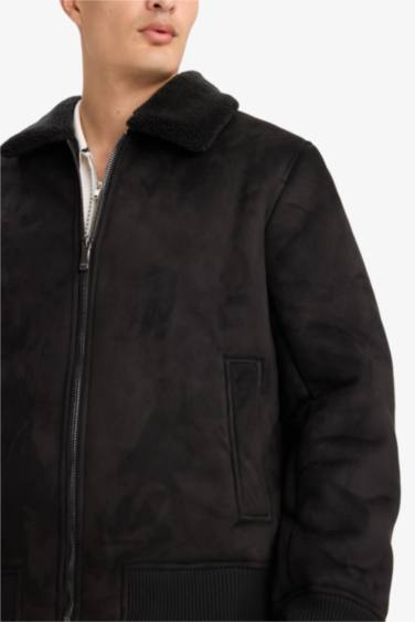 Slim Fit Dar Kesim Kürklü Polo Yaka Astarlı Fermuarlı Cepli Süet Mont