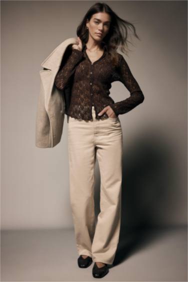 Ajurlu **Ipekyol** triko ile **Stradivarius** siyah geniş paça pantolonun minimalist uyumu — üzerine **Network** süet sneaker tamamlıyor.