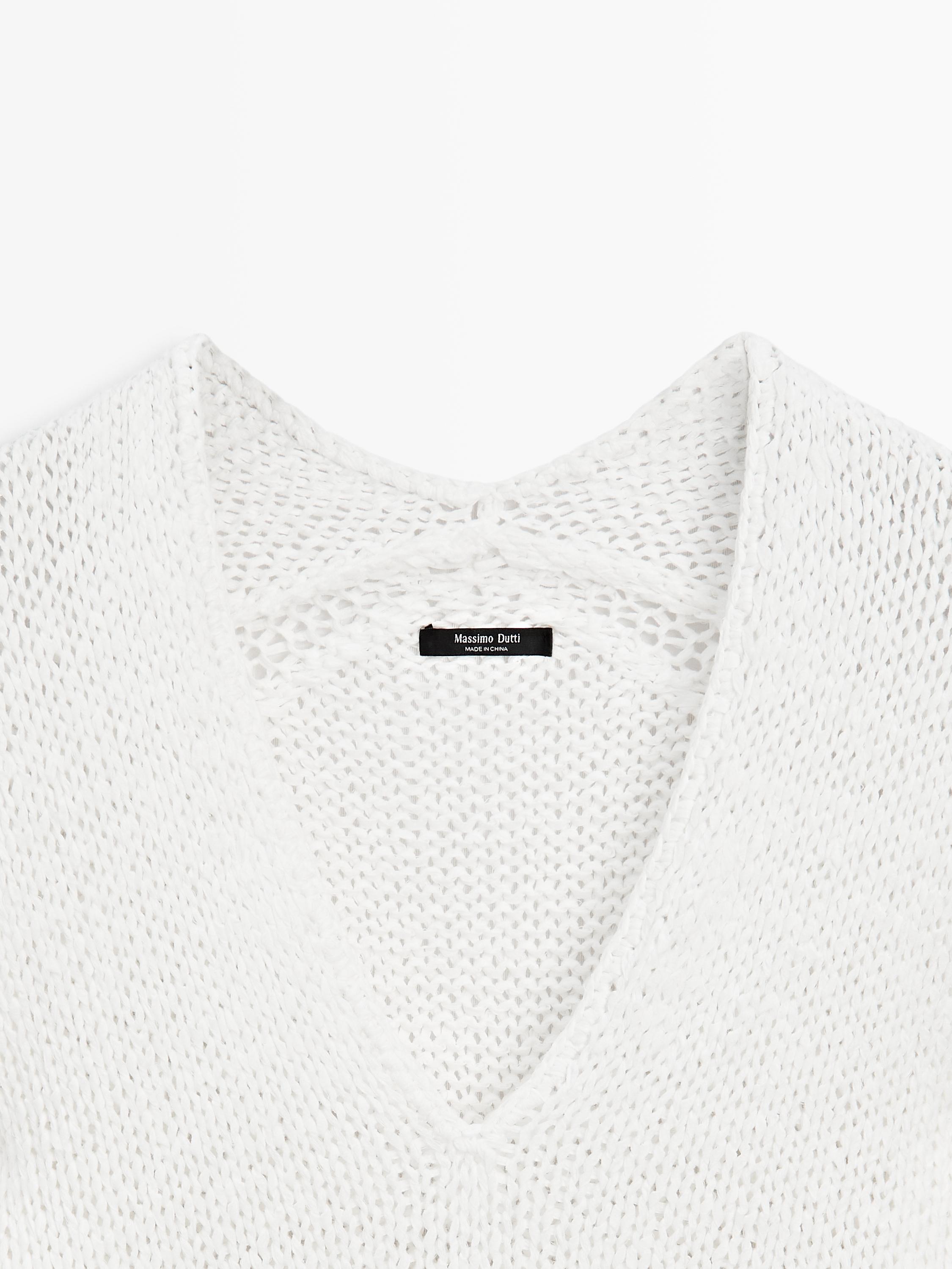 Beyaz ajurlu V yaka triko kazak, temiz ve sade bir estetikle dikkat çeker. Kaskatı kumaşıyla hafifçe sarkar ve vücuda dolgunca oturur; bu nedenle uzun gövdeli tipler için idealdir. Gövde hatlarını yumuşatmak ve dengeli bir görünüm elde etmek isteyenler için de harika bir seçimdir. Yazın açık havada veya sonbaharın erken günlerinde, beyaz tisörtle ve yüksek bel jeans ile kombinlenebilir; aynı zamanda klasik siyah pantolonla da ofis-sonrasi bir bulușmada şıkça giyilebilir. Renk olarak beyaz, her şeyle uyum sağlar; siyah deri kemer ve beyaz sneaker ile tamamlayarak daha dinamik bir hale getirebilirsin. Daha az detaylı bir look istersen, iç katman olarak da kullanabilirsin. Kuru hava ve güneşli günlerde tercih edilmesi önerilir; katlanmadan asılı tutulması, dokusunu korur.