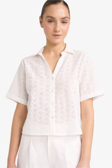 Regular Fıt Kaçık Yaka Brode Kısa Kollu Gömlek