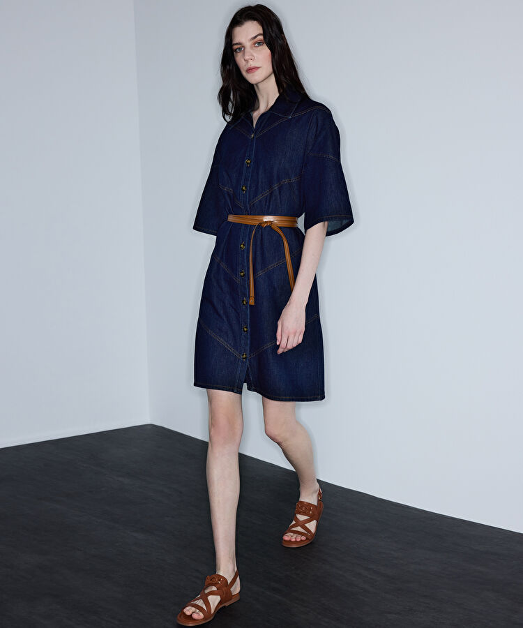 Kontrast kuşaklı denim elbise