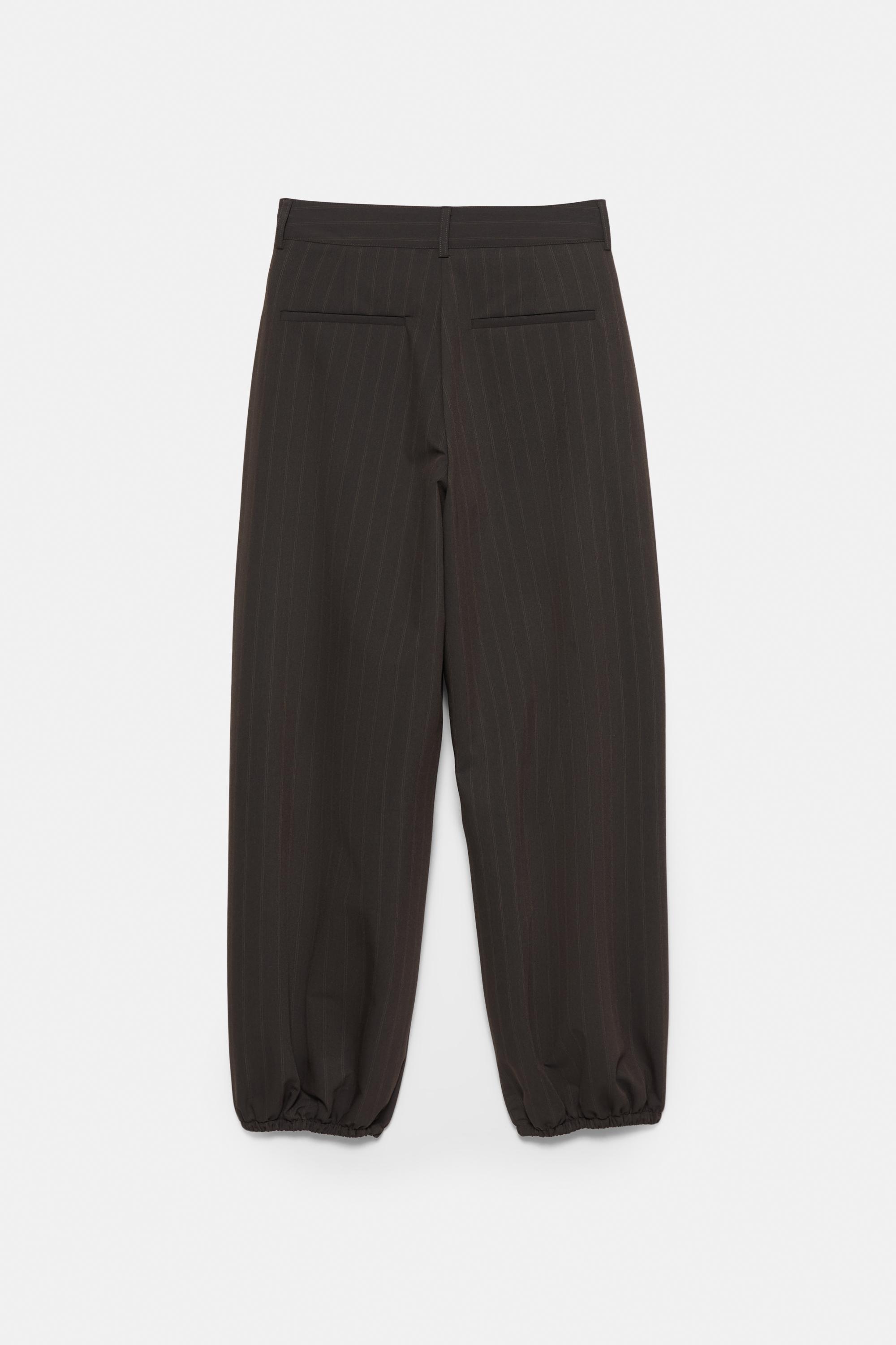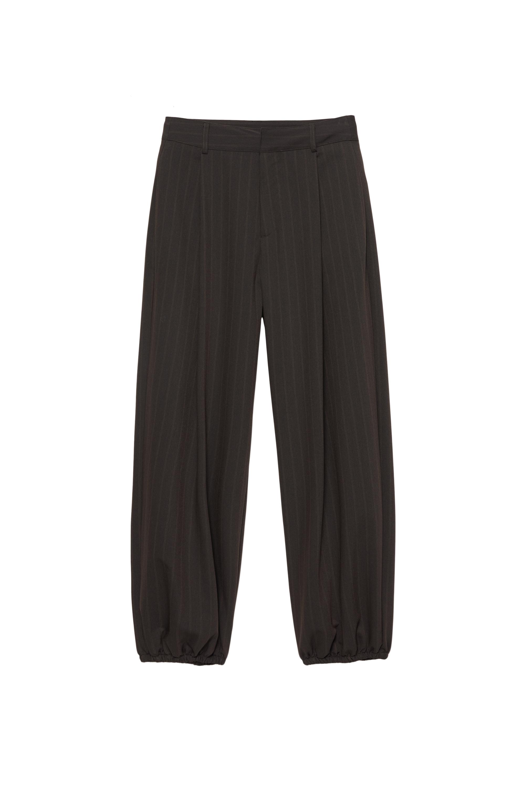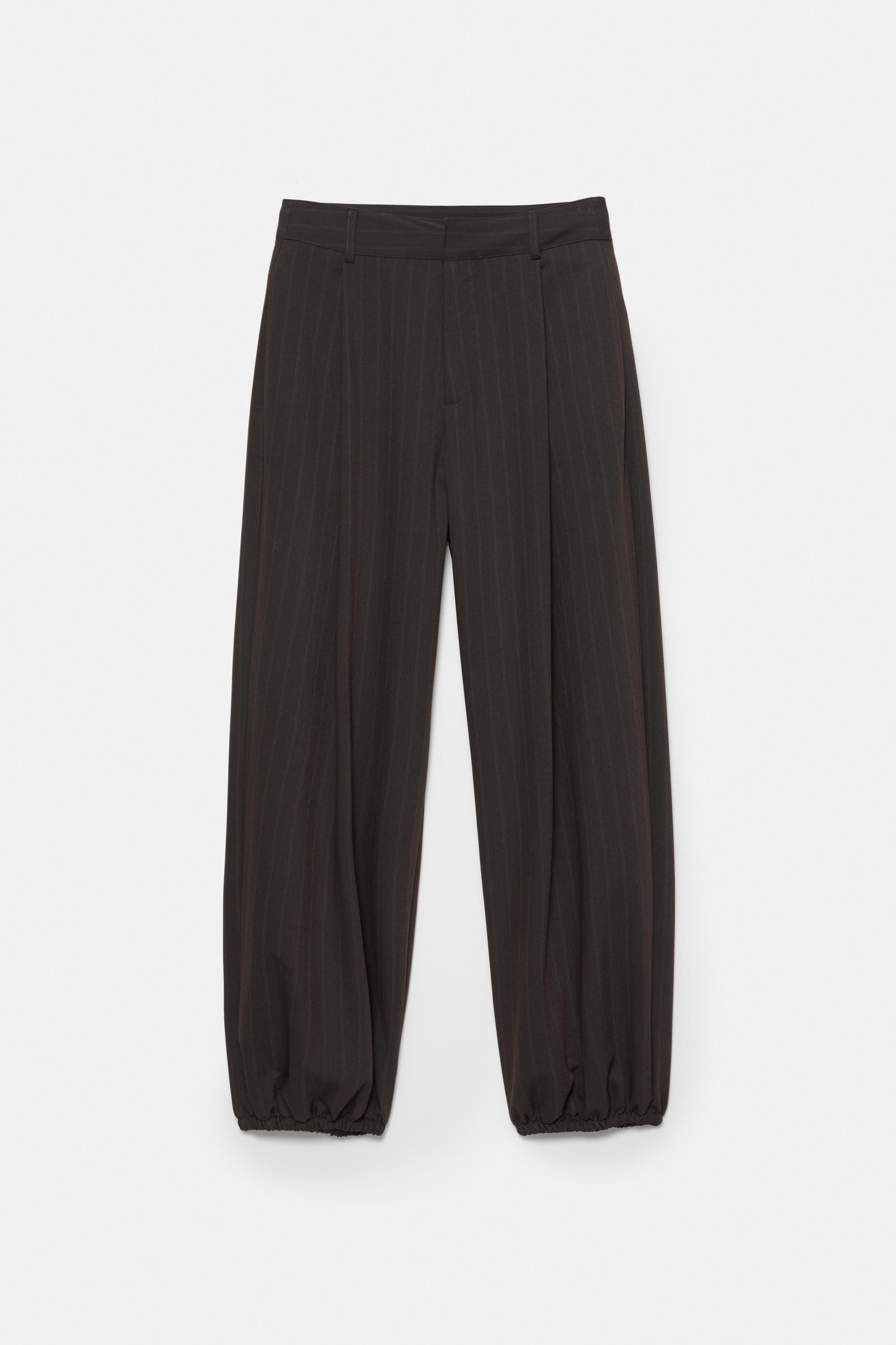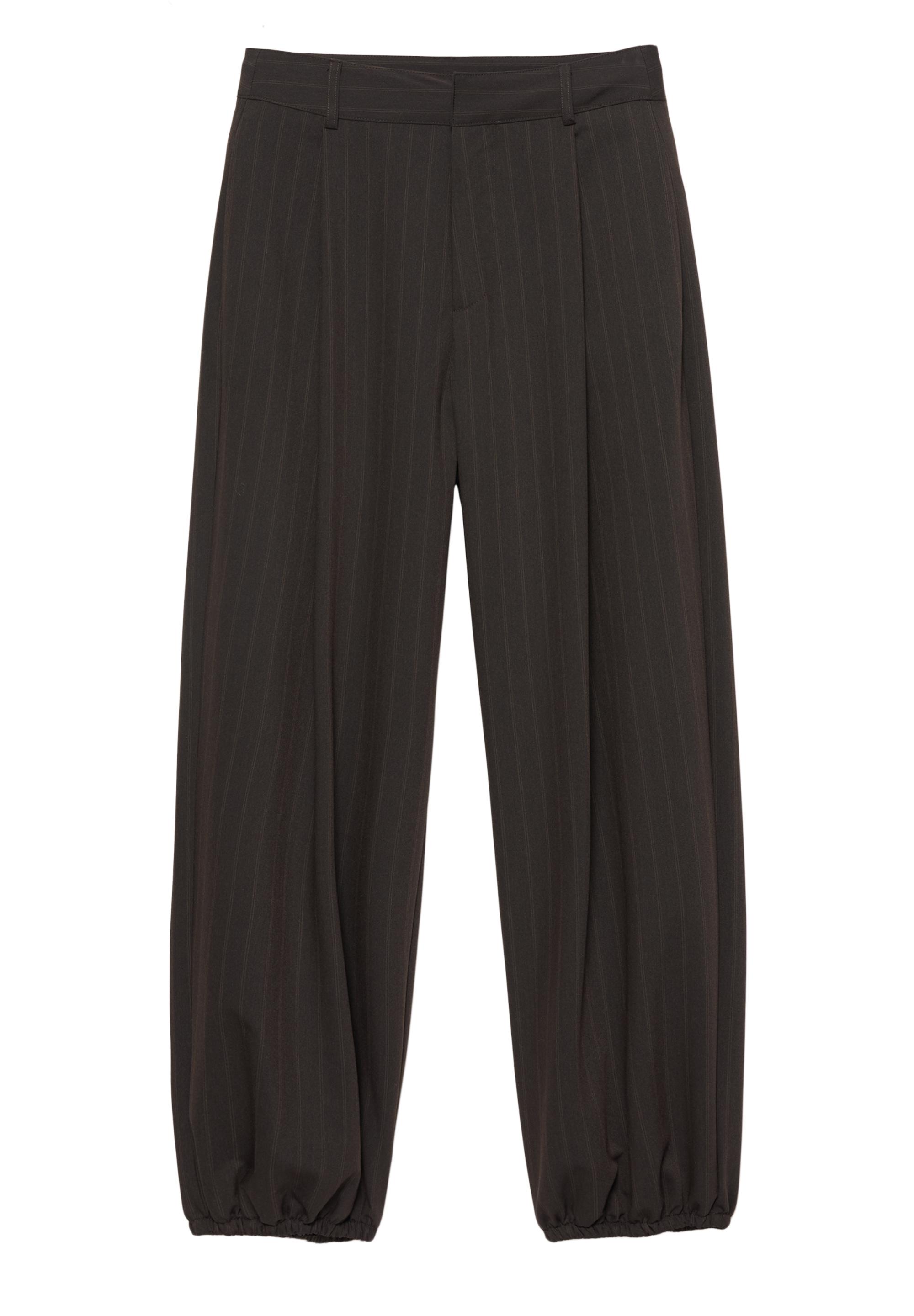 Çizgili tasarımlı, şalvar model, pile detaylı, kemer köprülü bel, elastik paçalı, düğme ve fermuar kapamalı kumaş pantolon.
