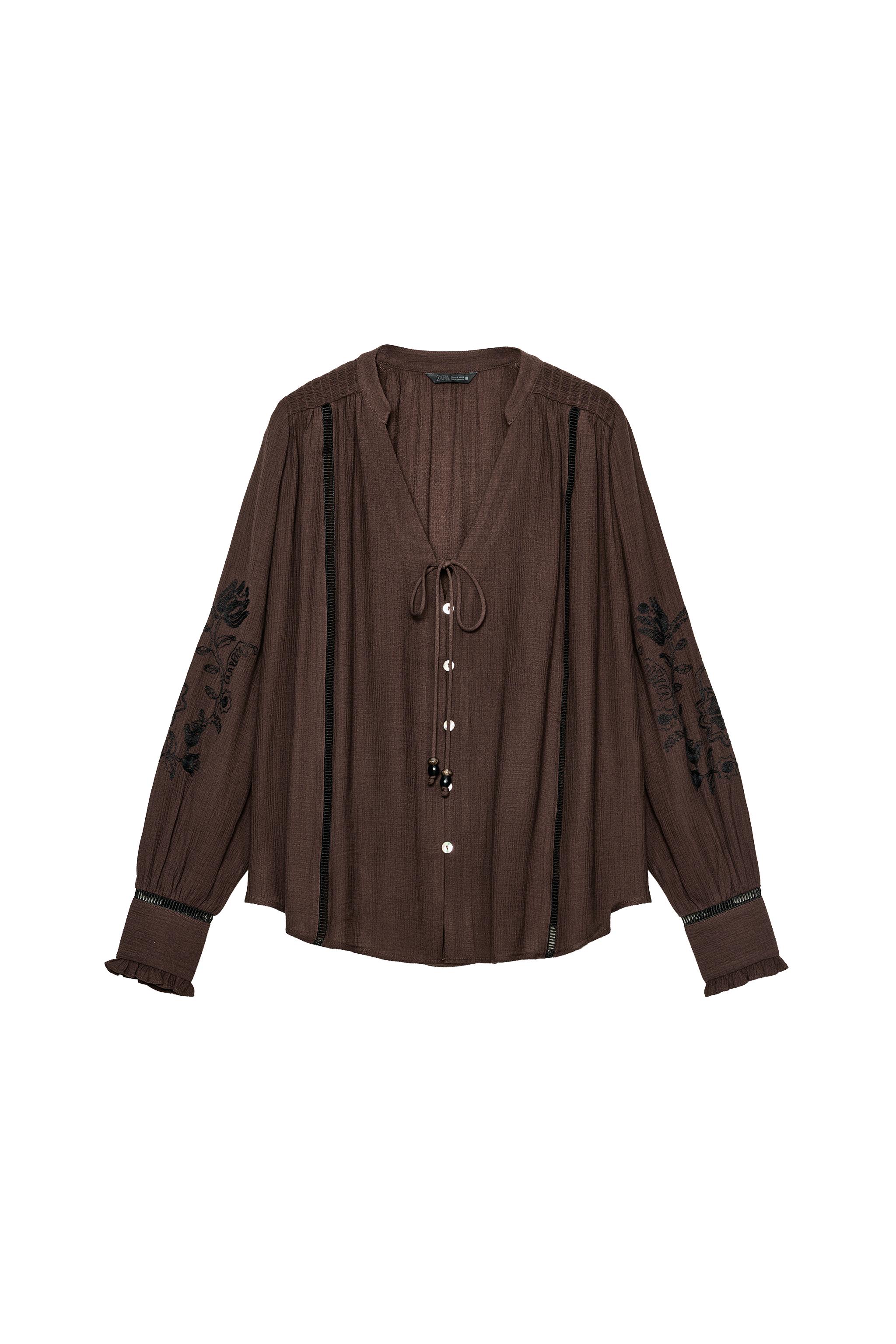 Bu dantel şeritli işlemeli gömlek, sadece dikkat çekici bir detayla değil, aynı zamanda konfor ve zarafetin harmanlandığı bir parçadır. Temiz hattı ve zengin dokusuyla hem günlük yaşamın hem de daha şık anların vazgeçilmezini oluşturur. Uzun gövdeli tipler için idealdir; dantelin hafifçe düşmesiyle vücut hatlarını dengeler ve doğal bir dengede kalmalarını sağlar. Beyaz tisörtle ve yüksek bel jeans ile kombinleme, gün içinde rahat ama stilinizi koruyan bir seçenek sunar. Daha şık bir görünüm isterseniz, siyah deri kemer ve beyaz sneaker ile tamamlayabilirsiniz. Ayrıca, açık yakalı bluz veya bol kalıp bir ceketin içine giyerek sonbahar aksam yürüyüşlerinde ya da ofis sonrası buluşmalarda da kullanabilirsiniz. Kahverengi ve siyah renkleri, notr tonlara sahip mevsimlerde oldukça uyumlu. Renk olarak kahverengi, sıcak bir dokunuş eklerken siyah ise daha soyut ve modern bir hava yaratır. Aksesuar olarak altın rengi bileklikler veya ince bir kolye ile daha fazla dikkat çekebilirsiniz. Gömleği katlamadan asmalı, bu sayede dantel işleminin bozulmasını önlersiniz. Aynı zamanda iç katman olarak da kullanılabilir; özellikle daha soğuk günlerde uzun kollu bir bluzun üzerine giymek, hem estetik hem de fonksiyonel bir çözüm sunar.