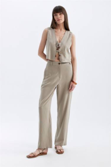 Fitted V Yaka Keten Karışımlı Önden Bağlamalı Yelek