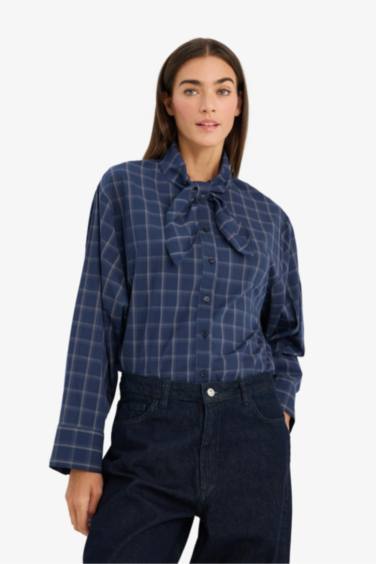 Oversıze Fular Yaka Kareli Poplin Uzun Kollu Gömlek