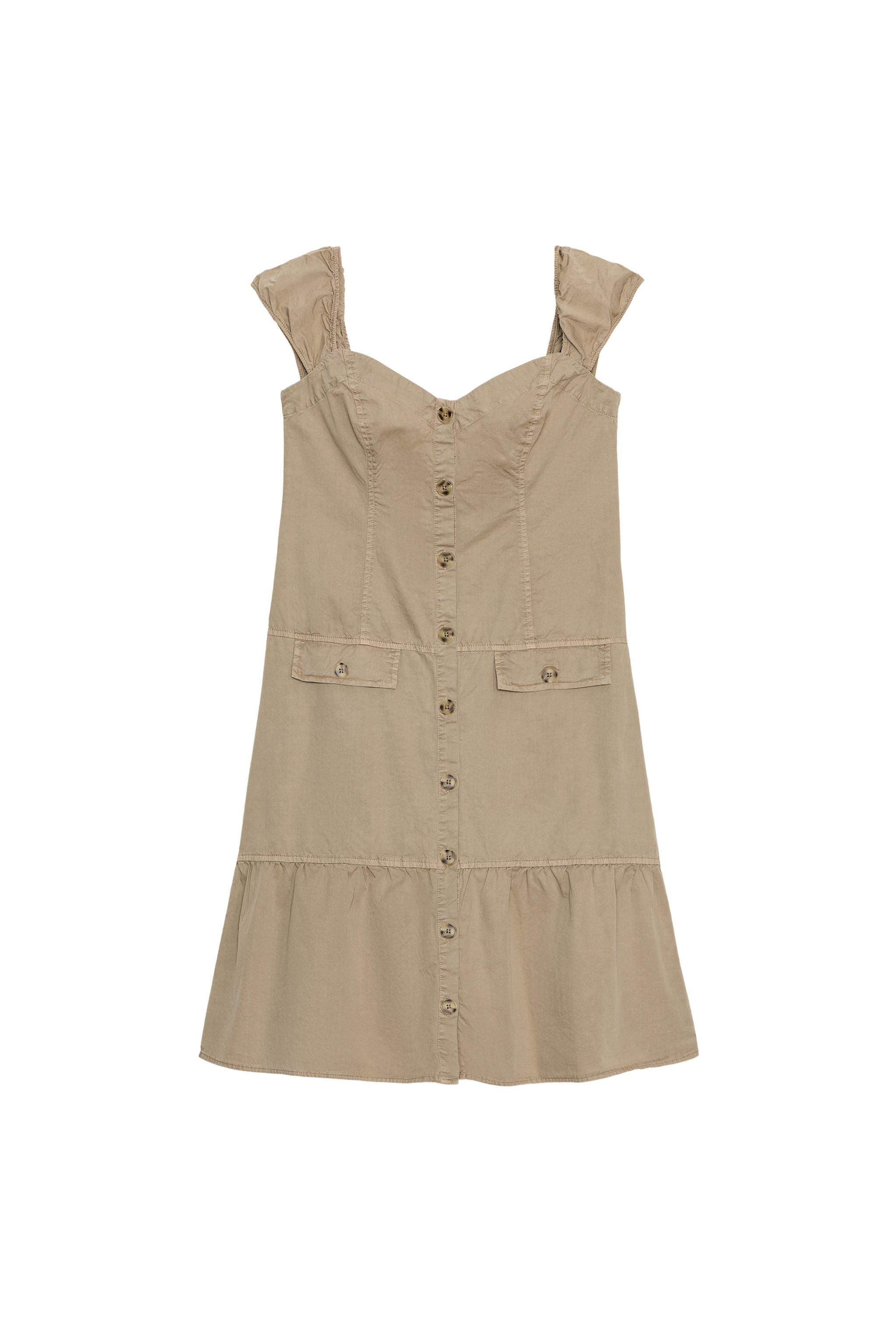Beige ve tannın temiz tonları ile sunulan bu düğmeli midi elbise, sade ama dikkat çekici bir estetik sunuyor. Kolları hafif bariyerli ve vücuda yapışkan kalıplı olduğu için uzun gövdeli tipler için ideal. Aynı zamanda omuzlarınıza hafif bir destek vererek genis omuzlari dengelemek için de harika bir seçim. Yazın açık havada yürüyüşlerde ya da sonbahar aksamında kahve buluşmalarında şıklıkla kombinlenebilir. Beyaz tisortle ve yüksek bel jeans ile casual bir günlük tarz oluşturabilirsiniz. Aynı zamanda siyah deri kemer ve beyaz sneaker ile tamamlayarak ofis-sonrasi bir akşam yemeğine da uygun hale getirebilirsiniz. Daha serin günlerde üzerine ince bir blazer veya pullu bir kazak ekleyerek mevsimsel bir görünüm elde edebilirsiniz. Giyimini kolay tutmak için katlanmadan asmalı, iç katman olarak da kullanabilirsiniz.