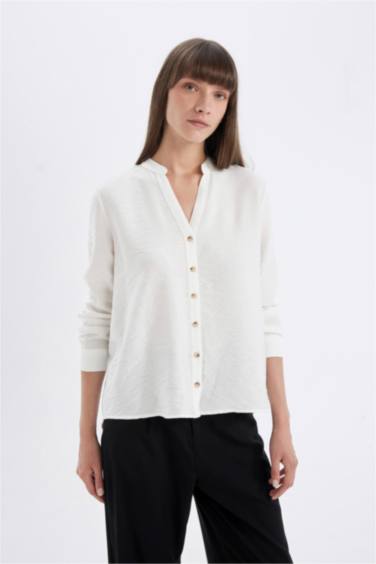Apaş Yaka Basic Düz Katlamalı Düğmeli Uzun Kollu Beyaz Gömlek
