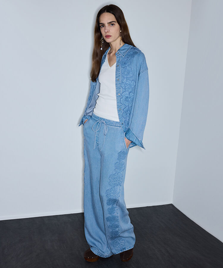 Beyaz ve açık mavi tonlarında basit ama dikkat çeken çiçek aplikeleriyle, bu pantolon temiz çizgiler ve minimalist estetikle bohemian bir hava yaratabiliyor. Uzun gövdeli tipler için ideal çünkü vücut hatlarını rahatlatırken dengeli bir görünüm sunuyor. Yaz aksamı yürüyüşlerinde veya ofis-sonrası kahve buluşmalarında, beyaz tisörtle ve yüksek bel jeans ile kombinlenebilir. Aynı zamanda açık mavi bir bluzla da çok şık bir günlük kıyafet oluşturur. Siyah deri kemer ve beyaz sneaker ile tamamlayarak daha dinamik bir look elde edebilirsin. Daha sade bir hale getirmek istersen, iç katman olarak da kullanılabilir; katlanmadan asılı tutmak kumaşın kalitesini korur.