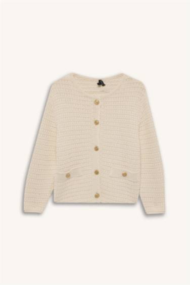 Regular Fit Bisiklet Yaka Dokulu Düğmeli Triko Hırka