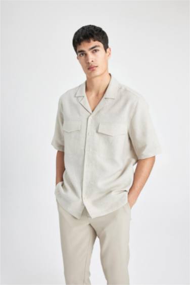 %100 Keten Relax Fit Polo Yaka Yazlık Basic Düz Kısa Kollu Gömlek