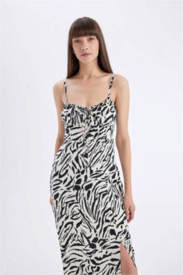 A Kesim Kalp Yaka Zebra Desenli Viskon Askılı Maxi Elbise