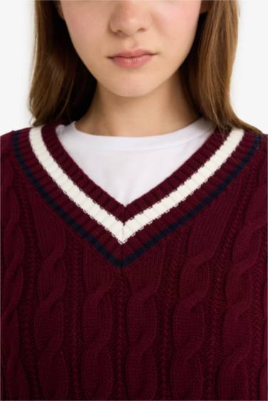 Regular Fit V Yaka Saç Örgülü Triko Kazak