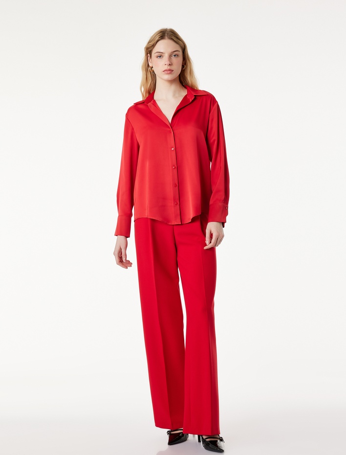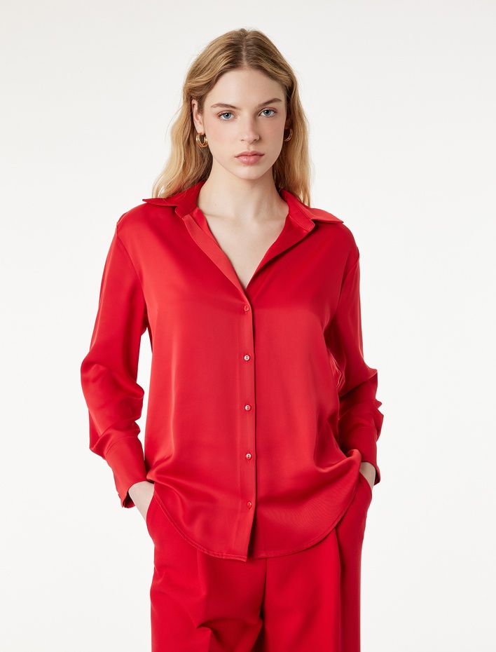 Klasik Yaka Uzun Kollu Rahat Kalıp Düğmeli Saten Gömlek