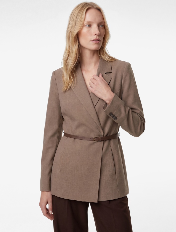 Kruvaze Yaka Uzun Kollu Kemerli Blazer Ceket