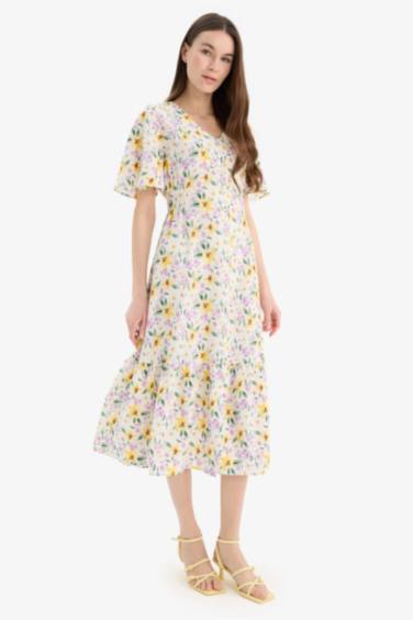 V Yaka Çiçek Desenli Kısa Kollu Midi Yazlık Elbise