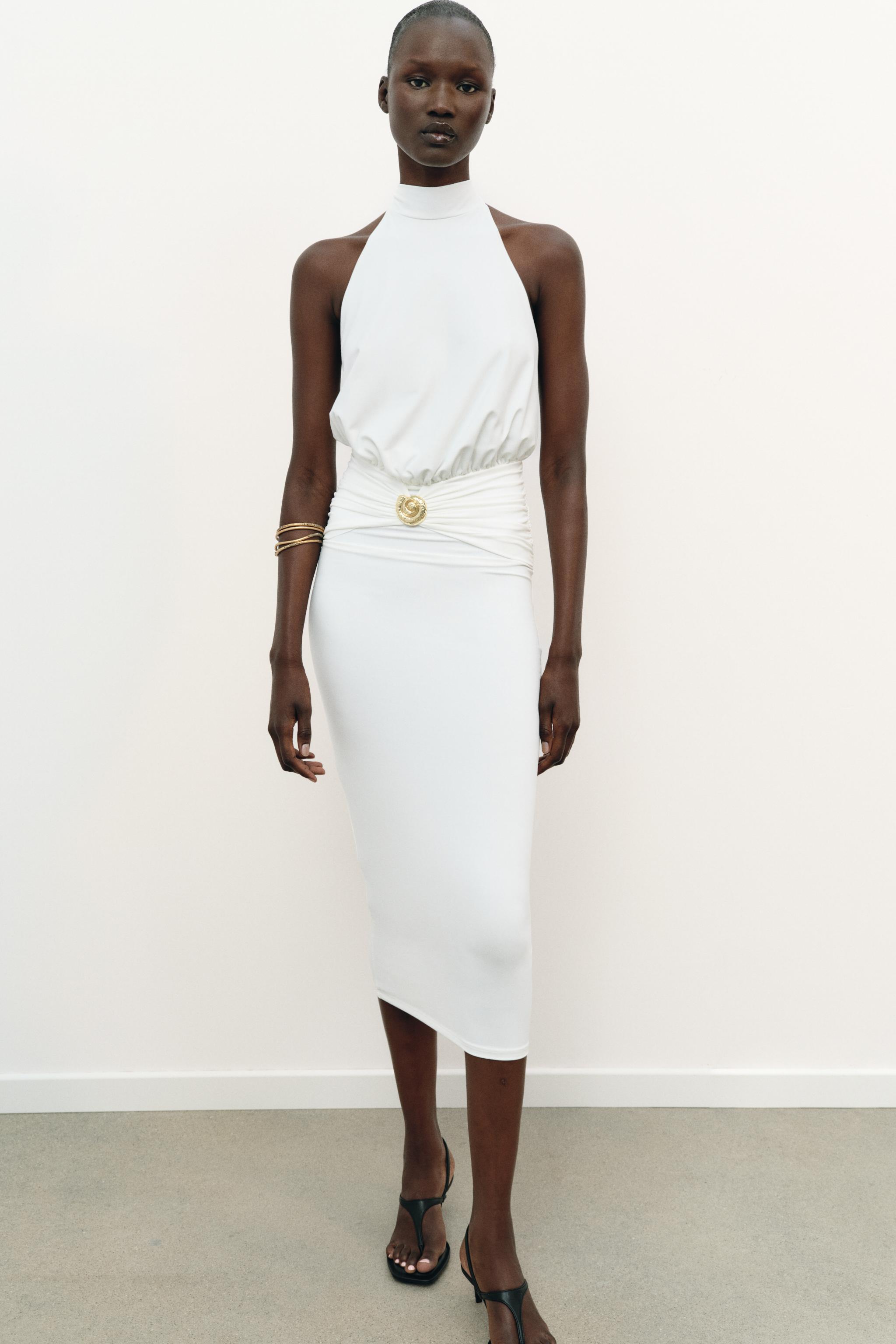 Bu drapeli halter yaka elbise, temiz ve dengeli bir estetikle dikkat çeker. Klasik yapısıyla hem gecelik hem de ofis-sonrasi bir araya gelmede zarif bir görünüm sunar. Beyaz versiyonu, klasik minimalist tarzda sade ve etkili; altın rengi ise ışıkta parlayan dokusuyla daha şık bir vurgu sağlar. Uzun gövdeli tipler için idealdir; omuz hizasında olan halter yaka, genis omuzlari dengelemek için de iyi bir seçimdir. Bir beyaz tisortle ve yüksek bel jeans ile gündüz kombininde rahatça giyilebilir; aynı zamanda siyah deri kemer ve beyaz sneaker ile tamamlayarak gece yürüyüşüne da uygun hale getirebilirsin. Aksesuar olarak basit bir zincir veya küçük kolye tercih ederek detayları vurgulayabilirsin. Kuru temizlik önerilir; katlanmadan asmalı, iç katman olarak da kullanılabilir.