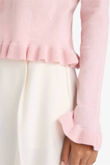 Regular Fit Bisiklet Yaka Düğmeli Fırfır Detaylı Triko Hırka