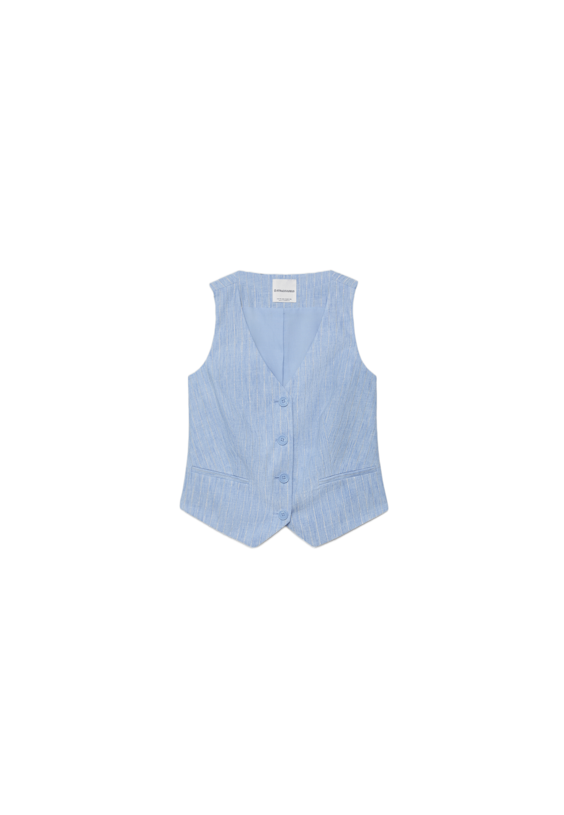 Light blue ve beyaz renklerdeki keten karışımlı yelek, temiz hatları ve minimal detaylarıyla her zaman dikkat çeker. Uzun govdeli tipler için idealdir; vücut hatlarını netleştiren kesimiyle hem estetik hem de fonksiyonel bir seçim sunar. Yazın açık havada bir kahve gezisinde ya da sonbaharda hafif bir rüzgarlı günlerde rahatça giyilebilir. Beyaz tisörtle ve yüksek bel jeans ile kombinleme yaparak şık ama samimi bir günlük görünüm elde edebilirsin. Aynı zamanda ofis-sonrasi bir bulușmada da uygun olur; siyah deri kemer ve beyaz sneaker ile tamamlayarak daha dinamik bir hale getirebilirsin. Yelek, katlanmadan asılı tutulmalı ve iç katman olarak da kullanılabilir. Temiz tonları sayesinde birçok parçayla uyum sağlar; klasik bir tarz isteyenler için vazgeçilmez bir parça.