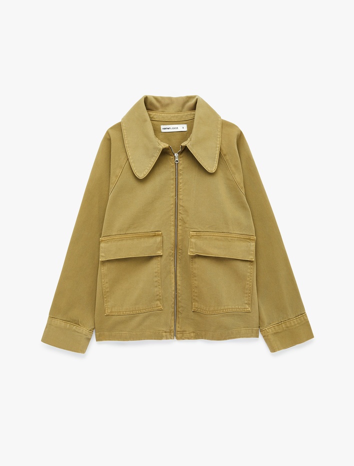 Klasik Yaka Fermuarlı Cep Detaylı Pamuklu Denim Ceket