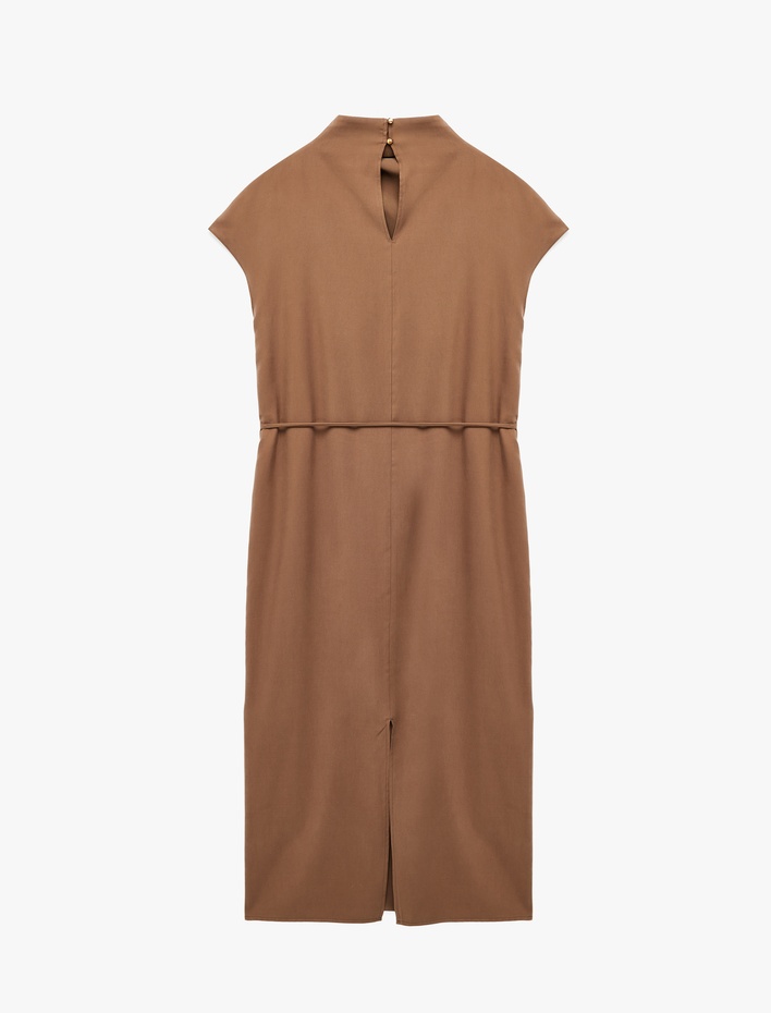 Viskon Kupro Kumaş Kap Kol Bağlama Detaylı Dik Yaka Drapeli Midi Elbise