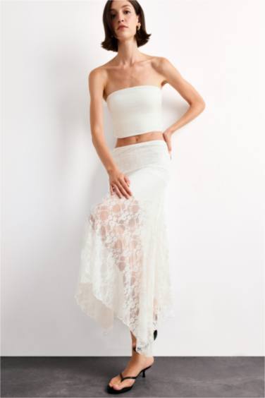 Beli Lastikli Yarım Astar Dantel Midi Etek