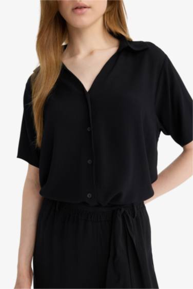 Regular Fit Kaçık Yaka Krinkıl Viskon Kısa Kollu Siyah Gömlek