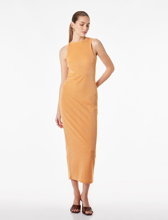 Slim Fit Kolsuz Bisiklet Yaka Parıltılı Kalem Elbise
