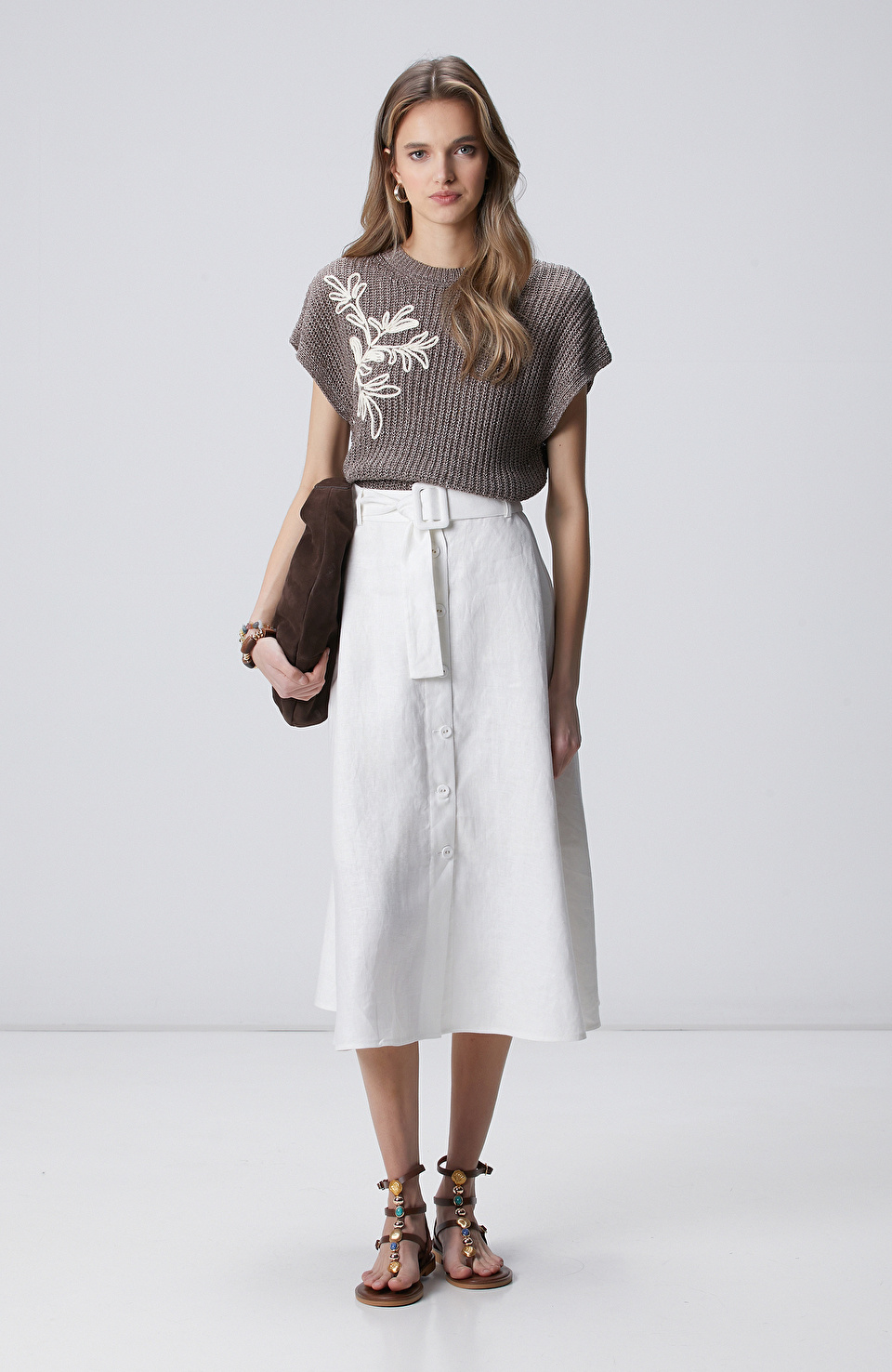 Kırık beyaz düğmeli keten midi etek, temiz ve sade bir estetikle dikkat çeker. Keten kumaşı sayesinde hafif ve hava altyapılı olması, giyim konforunu artırır. Uzun gövdeli tipler için idealdir; omuzlara doğru daralan kesimi vücut hatlarını doğal bir şekilde vurgular. Yazın açık renkli t-shirt ile veya sonbahar aksam yürüyüşlerinde koyu tonlu bluzla kombinlenebilir. Beyaz tılsım ve yüksek bel jeans ile de modern bir casual look oluşturabilirsin. Siyah deri kemer ve beyaz sneaker ile tamamlayarak gün içinde rahatça taşınabilir. Daha şık bir görünüm istersen, açık mavi bluz ve dökülen saçlarla bohemian bir hava yaratabilirsin. Katlanmadan asmalı, iç katman olarak da kullanılabilir. Düşük bakım gerektiren bu etek, uzun ömürlü ve çok yönlü bir parçadır.
