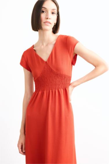 Fitted V Yaka Kısa Kollu Midi Elbise