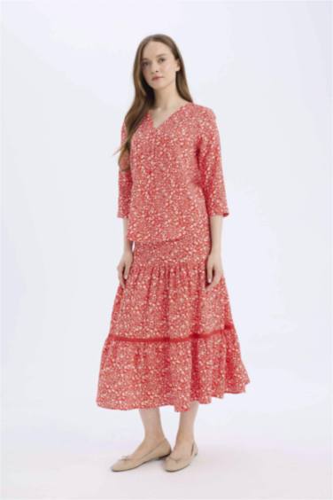 Regular Fit Çiçek Desenli Beli Lastikli Kiloş Midi Etek