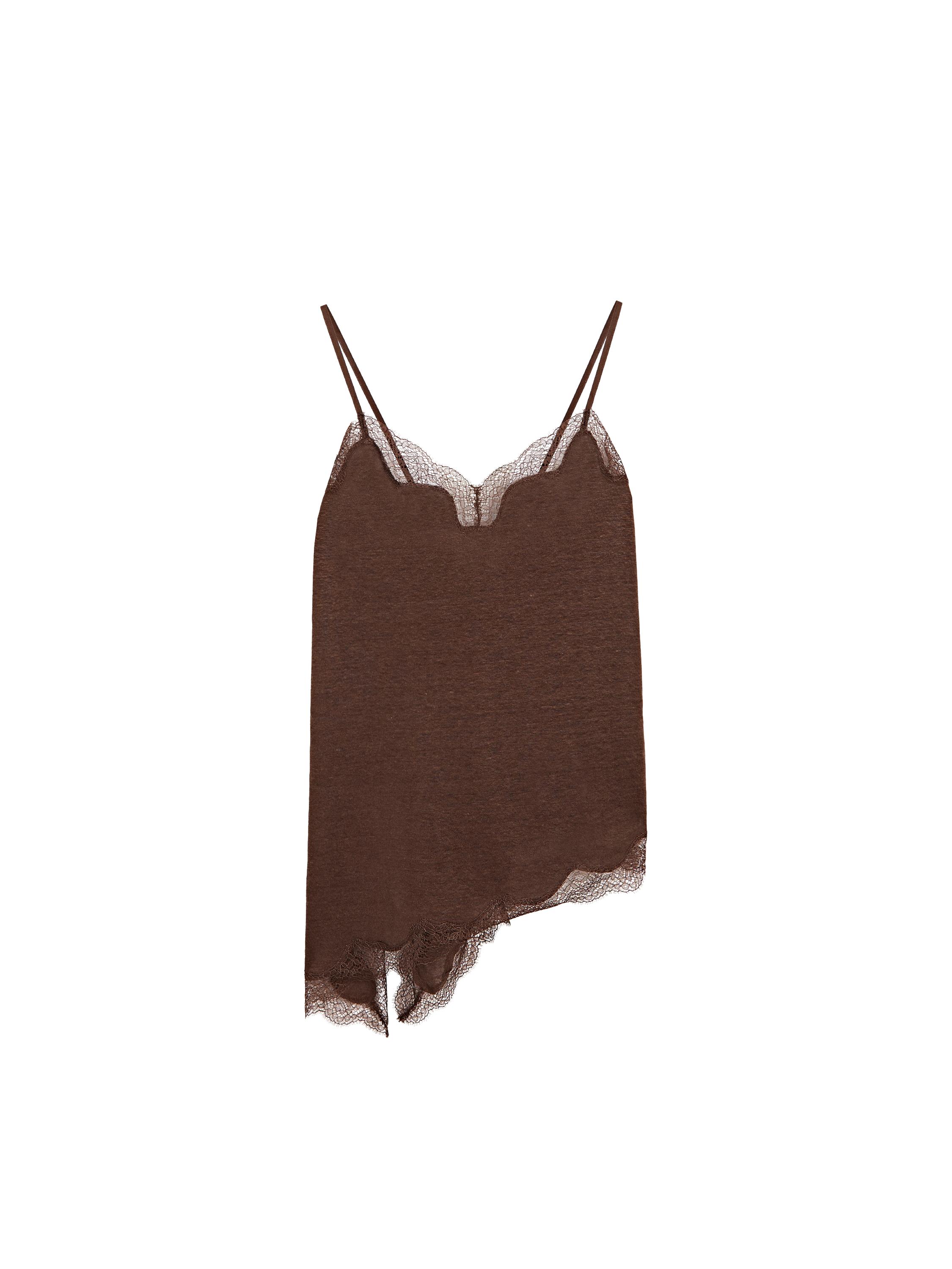 Asimetrik keten karışımlı dantelli bluz