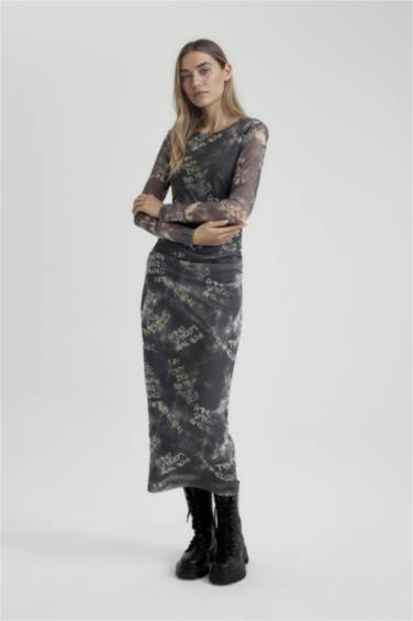 Bodycon Desenli Tül Uzun Kollu Maxi Elbise