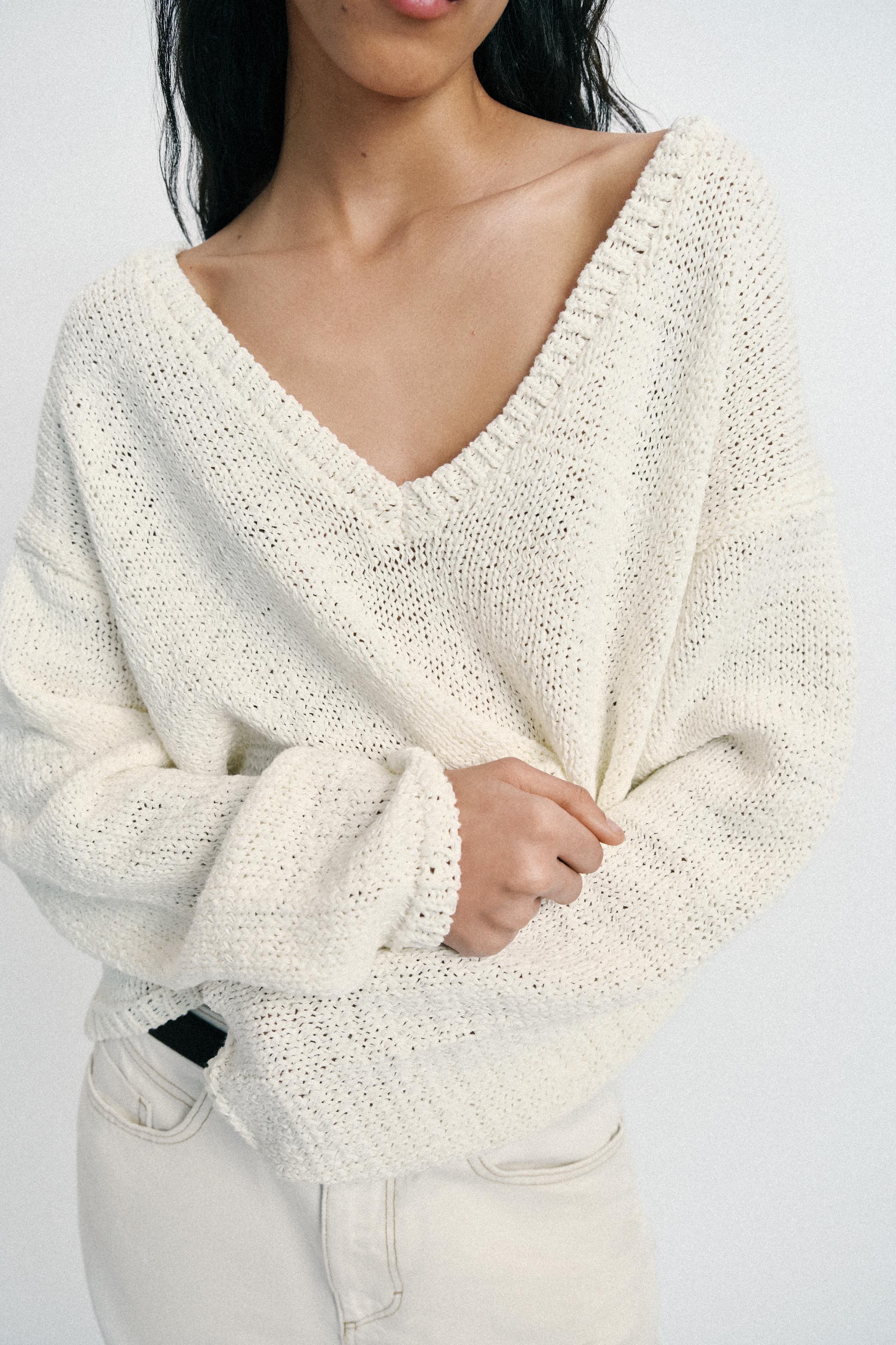 Off-white ve cream renklerindeki bu V yaka triko kazak, temiz hatlar ve minimal detaylarıyla bir kapsul gardirop için mükemmel bir parçadır. Oversize kesimiyle rahat bir giyim deneyimi sunarken, vücut hatlarını gizlemek isteyenler için de idealdir. Uzun gövdeli tipler için özellikle uygun olan bu kazak, omuz hattını dengeli bir şekilde kaplar ve üst üste giyimle de etkili görünüm sağlar. Yazın açık havada veya sonbaharın geçiş dönemlerinde, bol kollu tisörtün üzerine giyilebilir. Aynı zamanda ofis-sonrasi bulusmalarda da şıkça tercih edilebilir. Beyaz tisörtle ve yüksek bel jeans ile kombinleme yaparak günlük bir stili kolayca oluşturabilirsin; aynı zamanda koyu mavi blazerin üzerine sırtüstü giymek de oldukça modaya uygun bir seçenek olur. Siyah deri kemer ve beyaz sneakerla tamamlayarak daha dinamik bir görünüm elde edebilirsin. Daha şık bir hale getirmek istersen, ince bir kolye veya kulaklıkla da etkileyici bir dokunuş ekleyebilirsin. Kuru hava ve güneş ışığından uzak tutarak uzun ömürlü kalmasını sağlayabilirsin; aynı zamanda iç katman olarak da kullanılabilir.