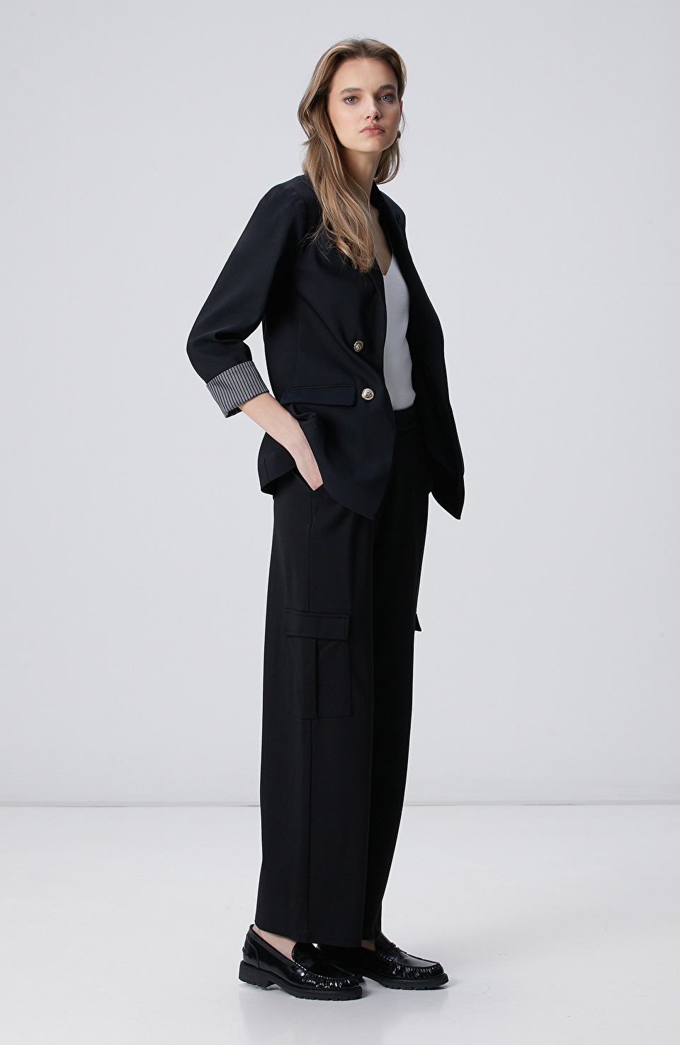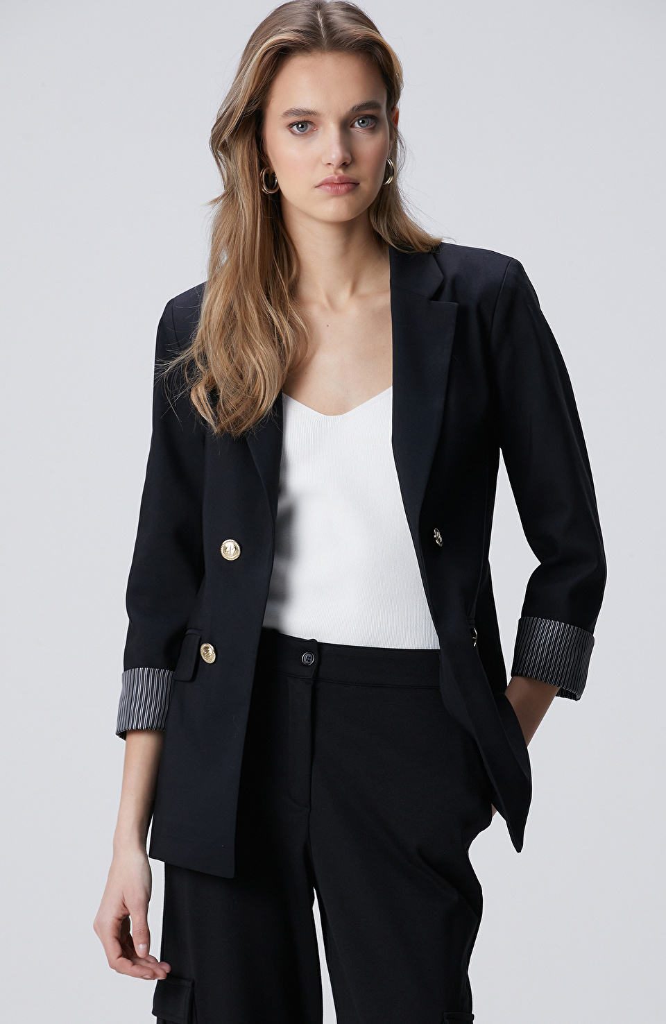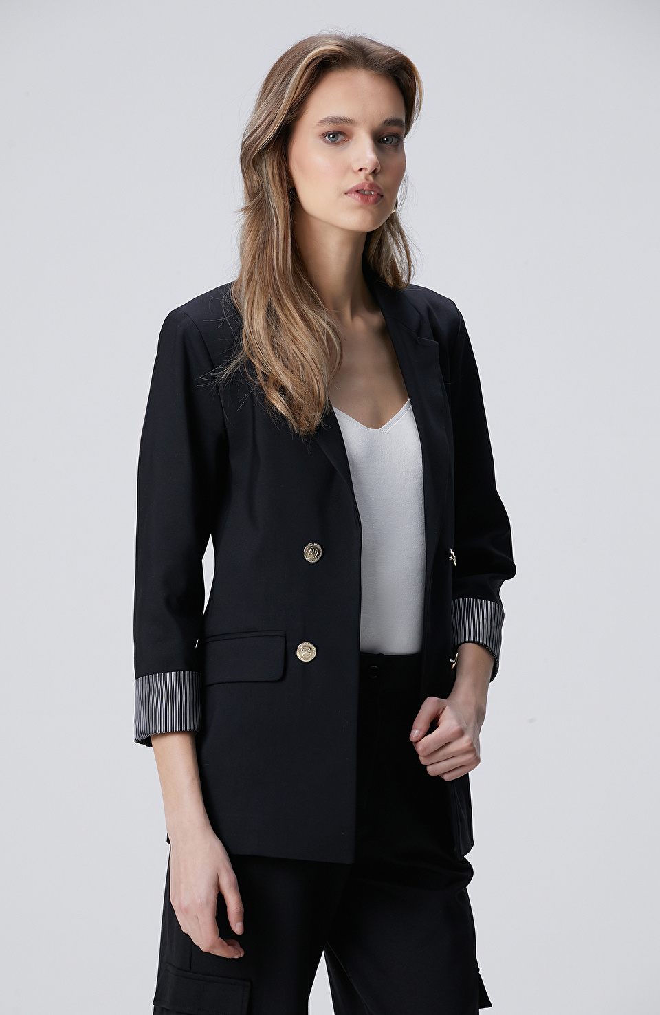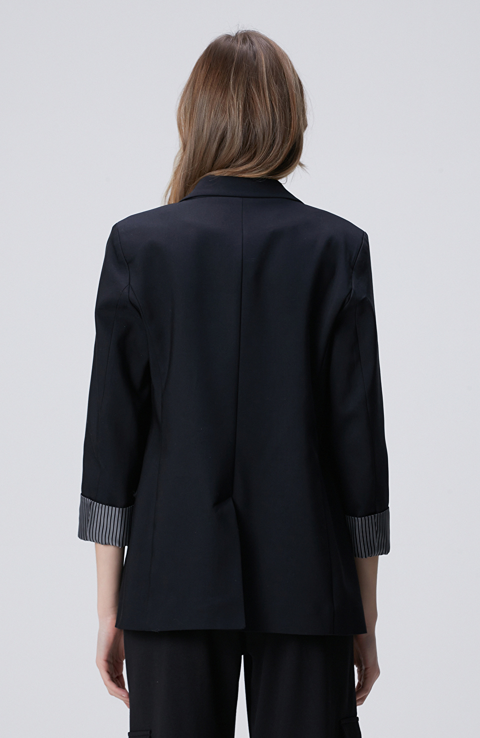 Siyah Açık Kruvaze Kol Ucu Desenli Astarlı Ceket