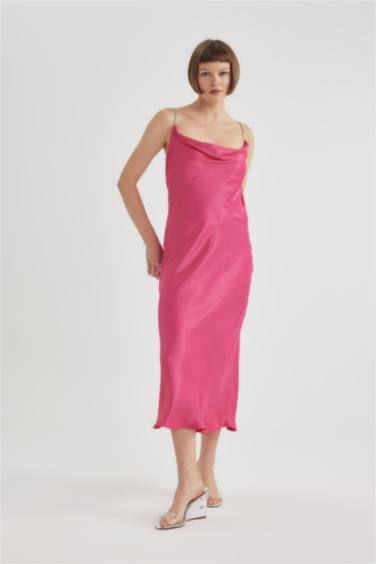 Bodycon Bisiklet Yaka Kısa Kollu Saten Midi Elbise