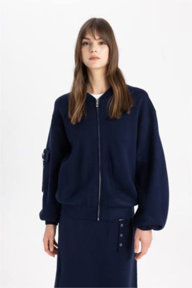 Kolej Yaka Basic Düz Fermuarlı Triko Bomber Hırka