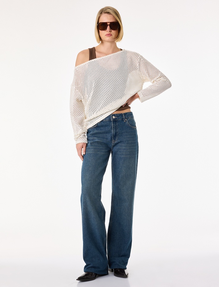Uzun Kollu Kayık Yaka Omzu Açık File Ajurlu Bluz
