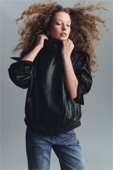 Dad Fit Dik Yaka Fermuarlı Suni Deri Ceket