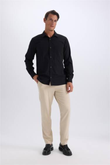 Regular Fit Polo Yaka Basic Düz Gofre Uzun Kollu Siyah Gömlek