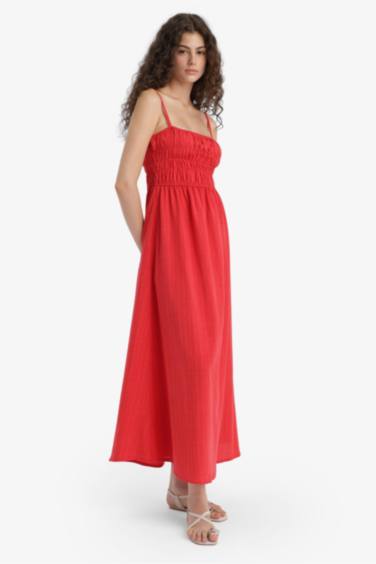 Keten Görünümlü Askılı Kırmızı Maxi Elbise