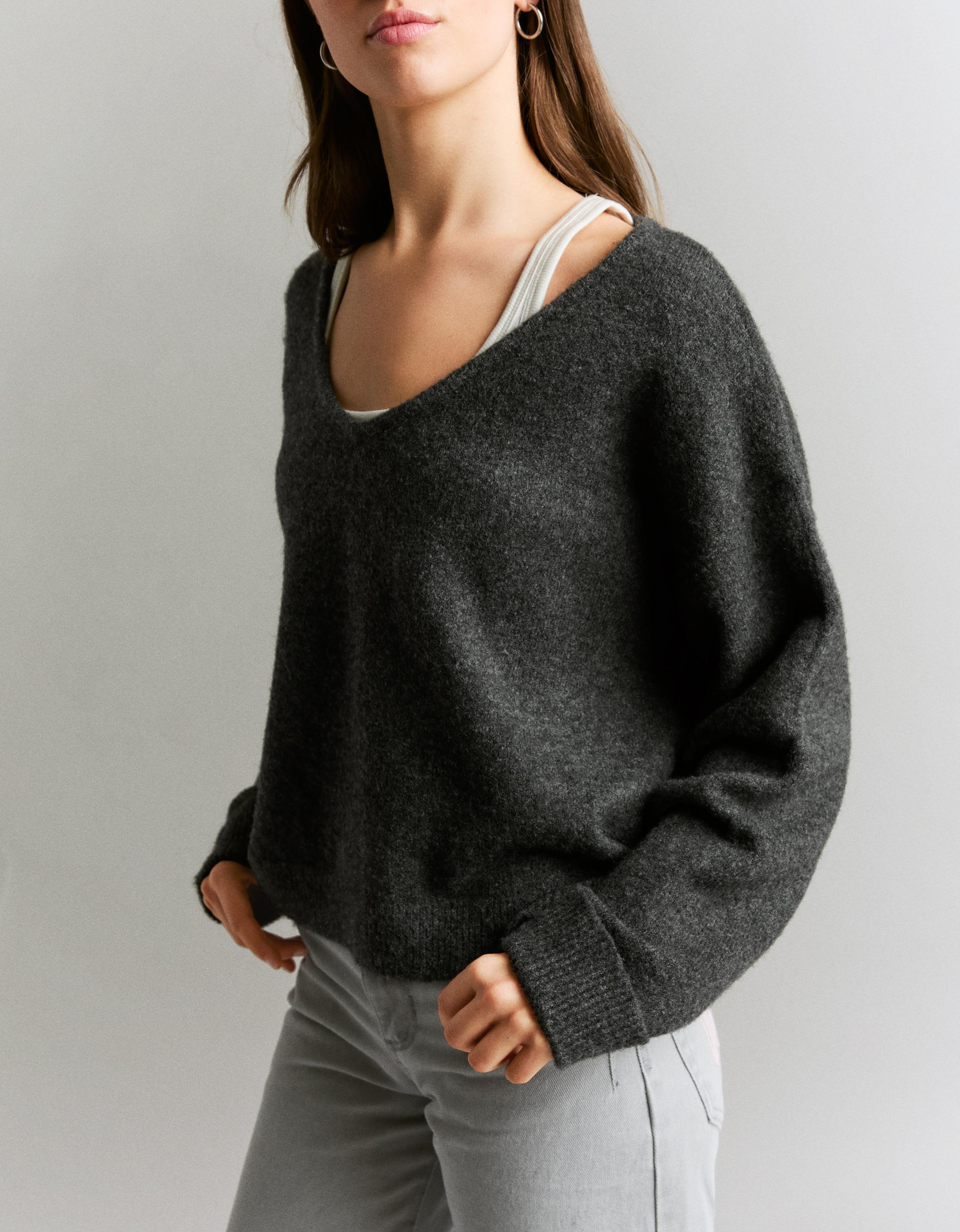 Bu V yaka kazak, temiz ve sade bir estetikle dikkat çeken, her gün kullanıma uygun bir parçadır. Uzun govdeli tipler için idealdir çünkü vücut hatlarını rahatlatırken gövde uzunluğunu dengeleyen bir dengede kesim sunar. Dark gray ve light gray renkleriyle hem klasik hem de modern bir havaya sahip olan bu kazak, notr tonlarla kolayca uyum sağlar. Beyaz tisortle ve yüksek bel jeans ile kombinleme yaparak minimalist bir günlük giysiyi oluşturabilirsin; aynı zamanda açık kollu bir bluzun altına iç katman olarak da kullanılabilir. Soğuk mevsimlerde kışlık pantolon ve botla tamamlayarak dışarıda rahatça giyilebilir. Siyah deri kemer ve beyaz sneaker ile tamamlayarak daha dinamik bir görünüm elde edebilirsin. Katlanmadan asmali, nemli hava ve güneş ışınlarından korunmak için iyi bir bakımı önemlidir.