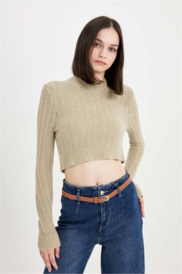 Regular Fit Crop Bisiklet Yaka Örgü Delikli Triko Kazak