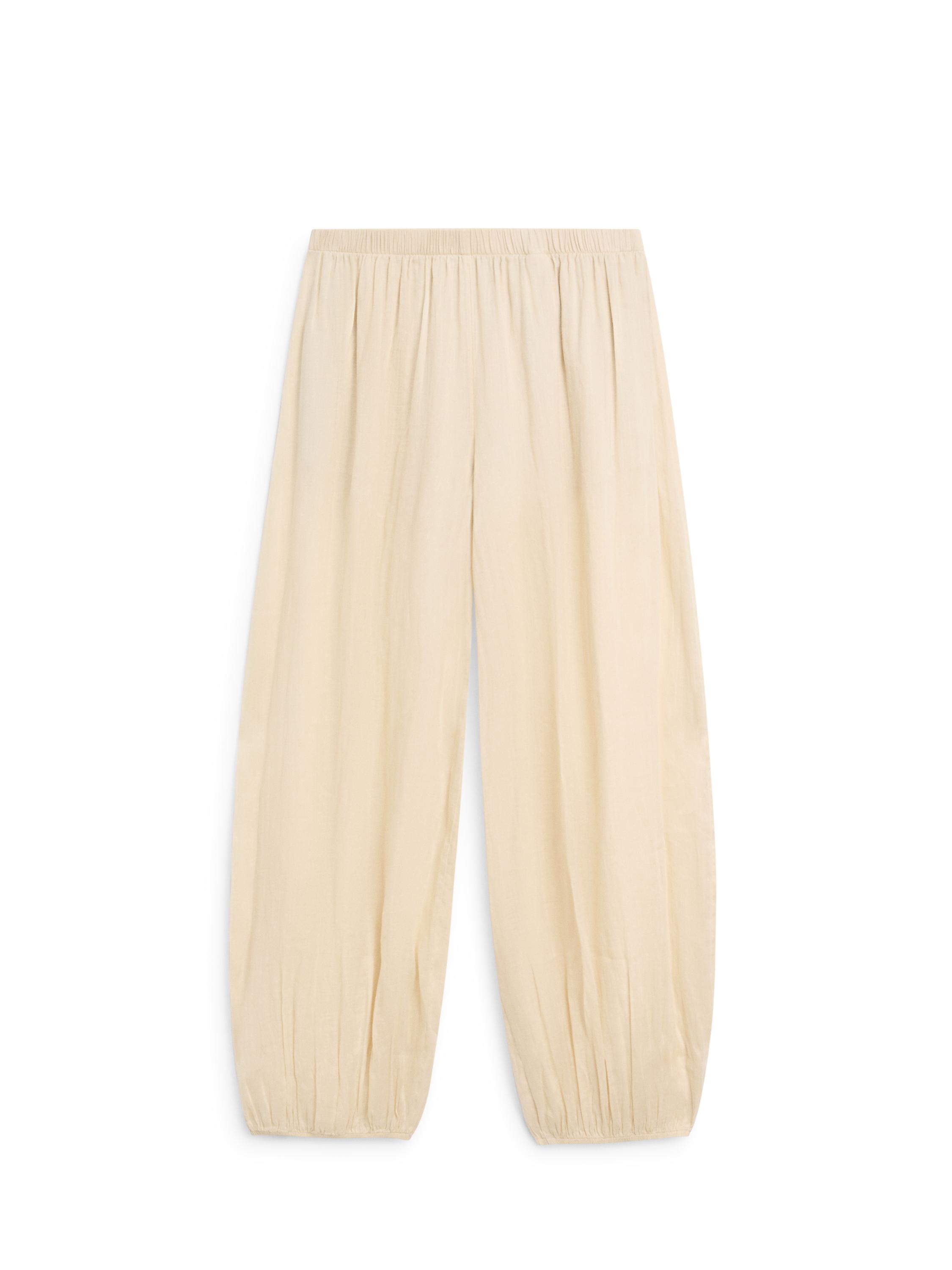 Bu şalvar pantolon, temiz ve dengeli bir tarzın kalbinde yer alıyor. Rami karışımlı dokusuyla hafif ve rahat bir taşımaya sahip, aynı zamanda doğal bir estetik sunuyor. Beige ve cream tonları, her gün giyilebilir bir esneklik sunarken, zamansız bir görünüm sağlıyor. Uzun govdeli tipler için idealdir; aksi takdirde omuzlarınıza hafif bir ağırlık vererek dengeleyebilirsiniz. Beyaz tisortle ve yüksek bel jean ile kombinleme, casual bir günlük kıyafet oluştururken, açık yaka bluzla ve hafif püsküllü bir ceketle de daha serin bir bohemian havası yakalayabilirsiniz. Dışarıda yürürken veya ofis-sonrası bir buluşturma için harika bir seçim. Siyah deri kemer ve beyaz sneaker ile tamamlayarak modern bir detay ekleyebilirsiniz. Katlanmadan asmalı, nemli ortamlardan uzak tutmalı ve iç katman olarak da kullanılabilir. Her zaman kullanışlı ve zarif bir parça olmaya devam edecek.