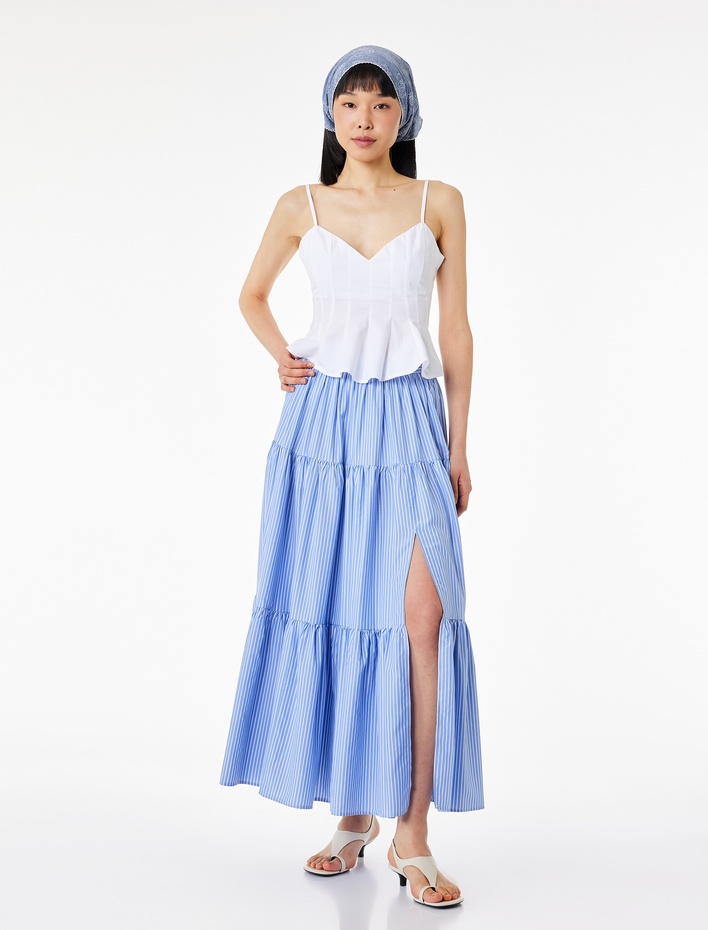 Katlı Çan Kesim Poplin Çizgili Midi Etek