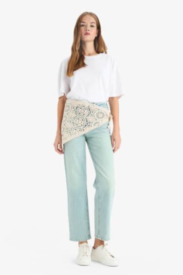 Comfort Straight Normal Bel Nakış Detaylı Bilek Boy Jean Yıkamalı Pantolon