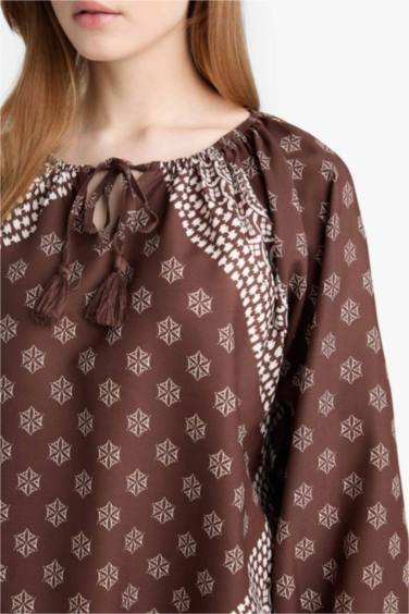 Relax Fit Bisiklet Yaka Bağlamalı Desenli Uzun Kollu Bluz