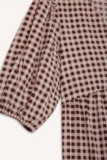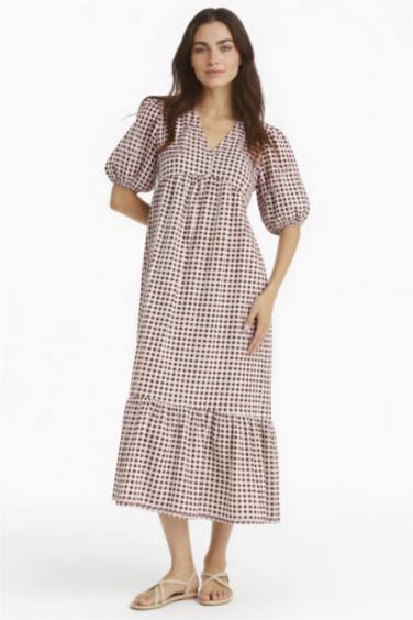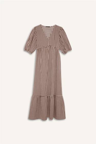 V Yaka Kareli Gofre Dokulu Kısa Kollu Midi Elbise