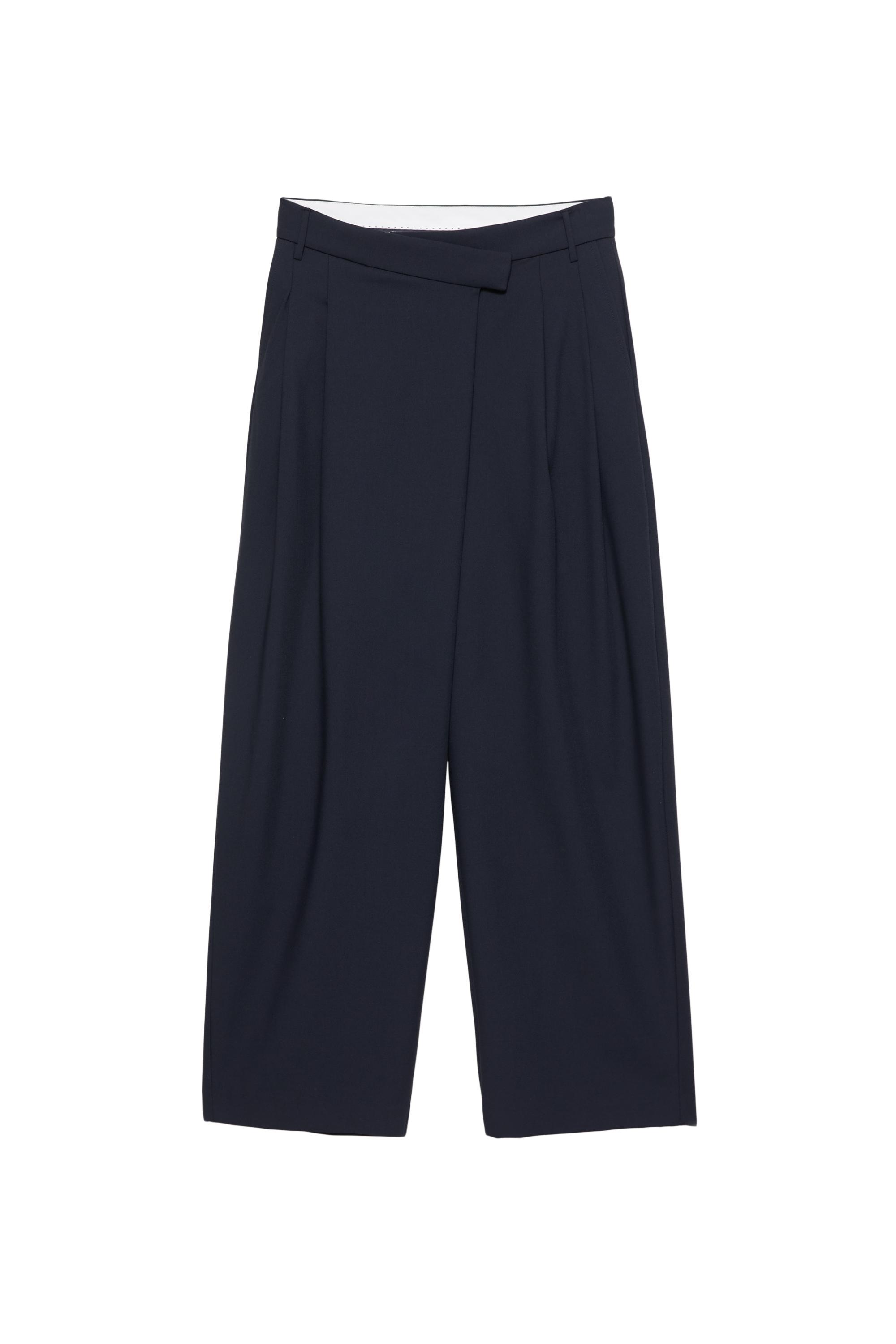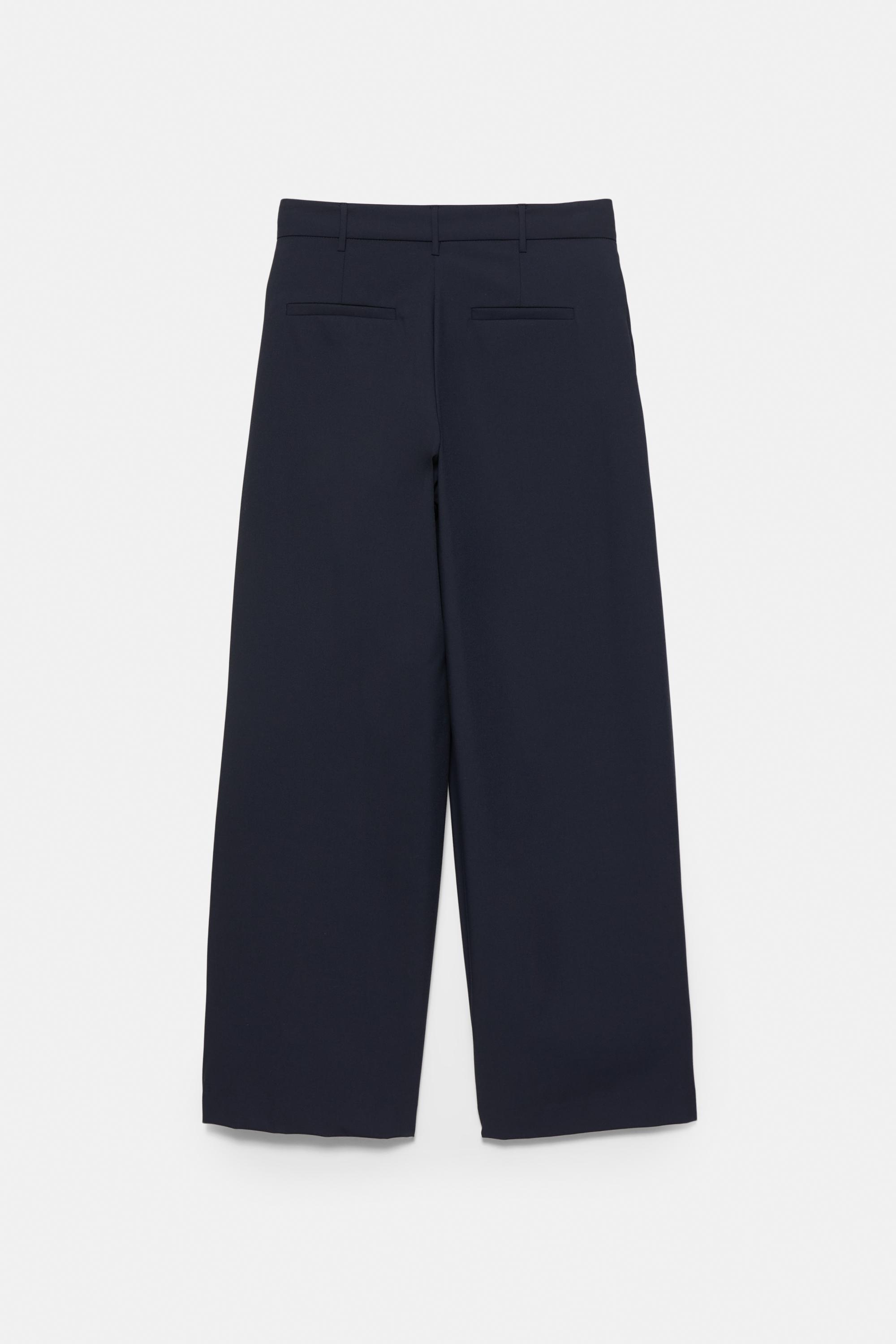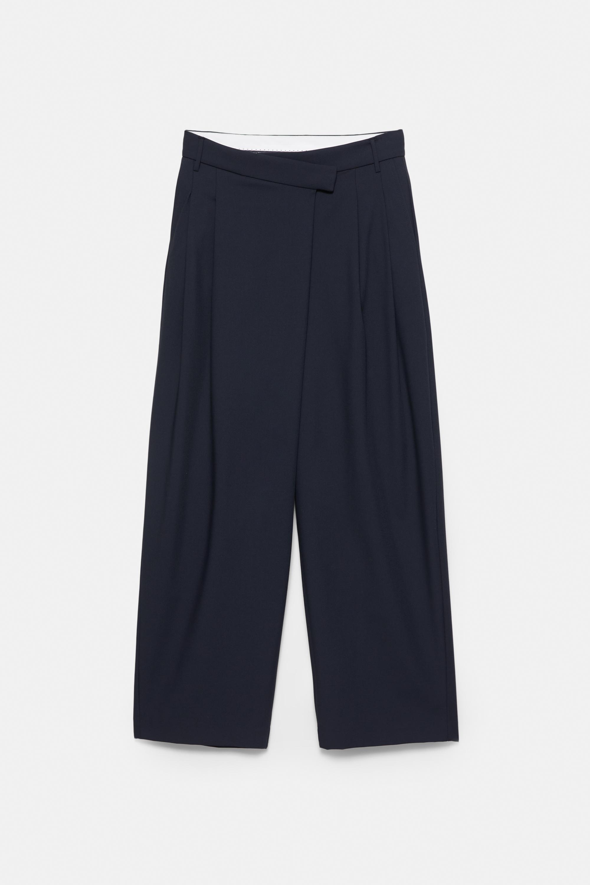 Kruvaze belli, kemer tokalı, fermuarlı ve düğmeli, pilili, yan cepli ve hafif esnek kumaştan yapılmış kumaş pantolon.