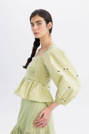 Lug Von Siga x DeFacto Fitted Kare Yaka Desenli Brode Yarım Kollu Bluz