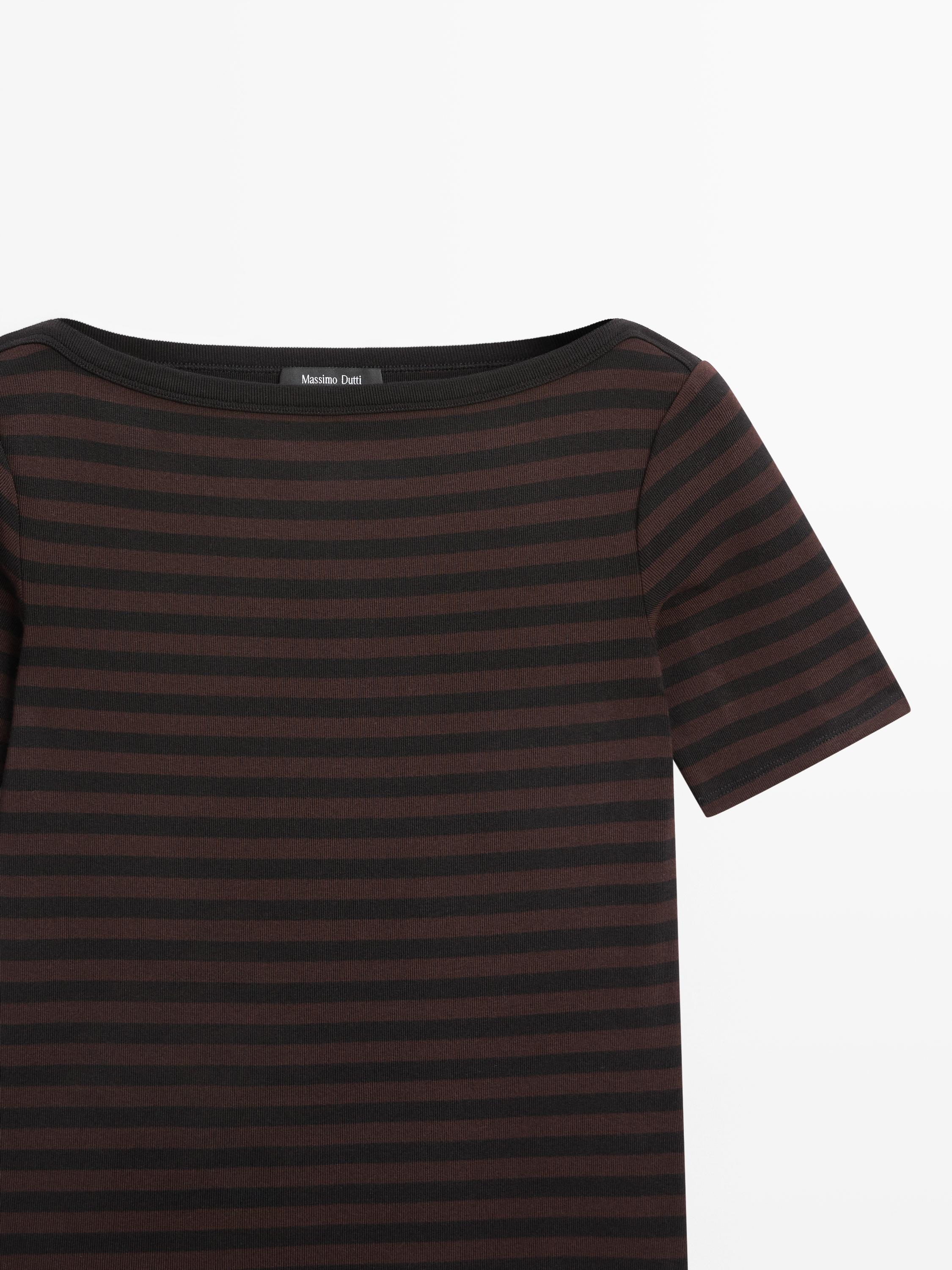 Çizgili kısa kollu geniş yaka t-shirt — massimodutti | Oneri